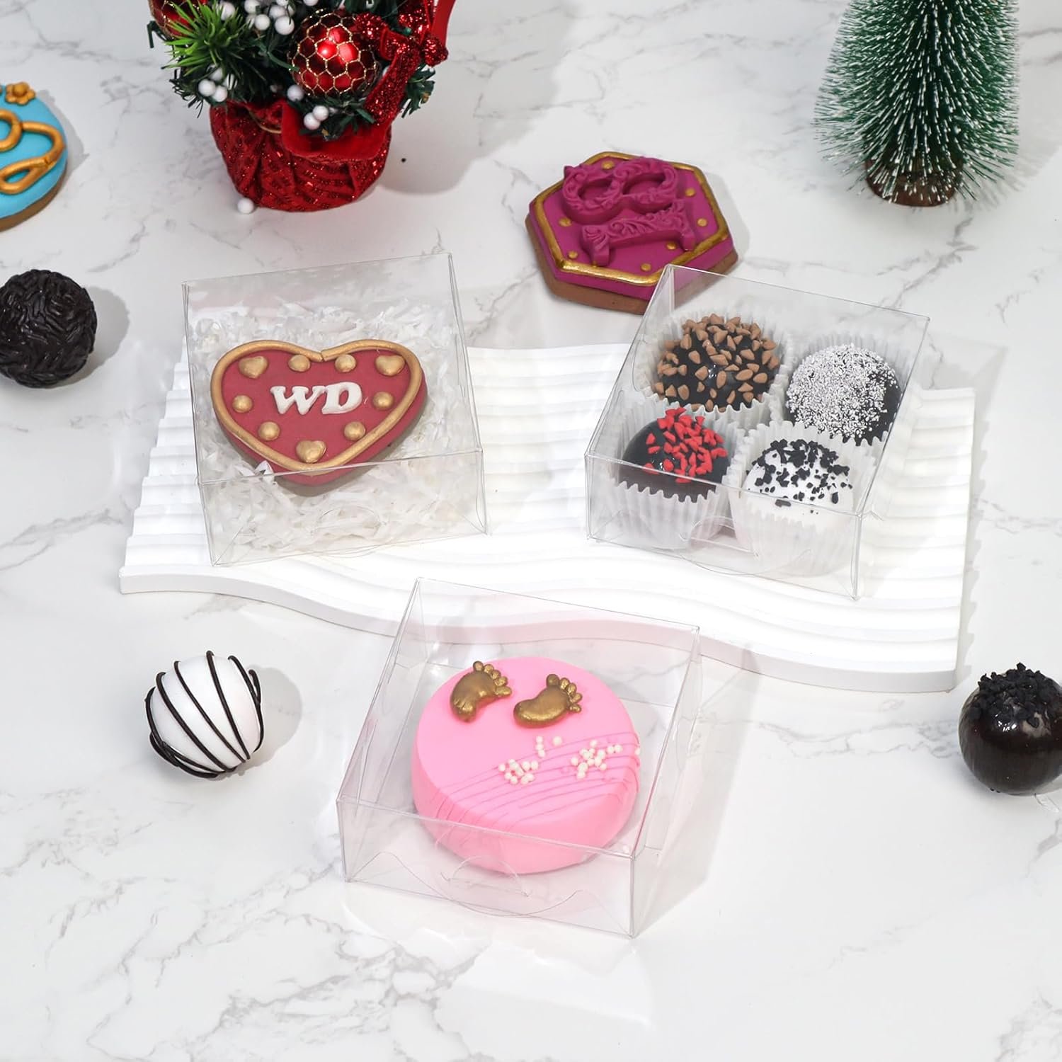 Our cookie boxes are engineered for durability and style. Each box is made from thick, sturdy plastic that can hold up to 10 pounds of weight without compromising integrity. The fully clear window design allows your delicious creations to shine through, adding an elegant touch that enhances visual appeal.
