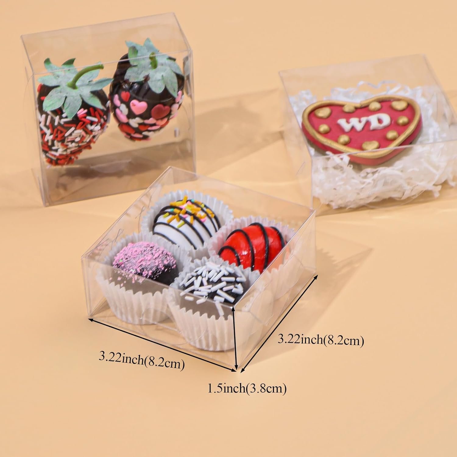 Emphasizing precision in sizing, these boxes measure 3.2 inches in length (8.2 cm) by 3.2 inches in width (8.2 cm) by 1.5 inches in height (3.8 cm). This compact yet spacious dimension is ideal for an assortment of small pastries, macarons, brownies, donuts, truffles, chocolate-dipped strawberries, soaps, or other petite gifts. The square shape provides stability, preventing shifts during transport.